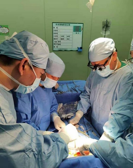普外科主任崔云甫教授(右)和膽胰外科蘇志雷副教授(左2)應(yīng)用經(jīng)肝臟動脈灌注驅(qū)血技術(shù)完成