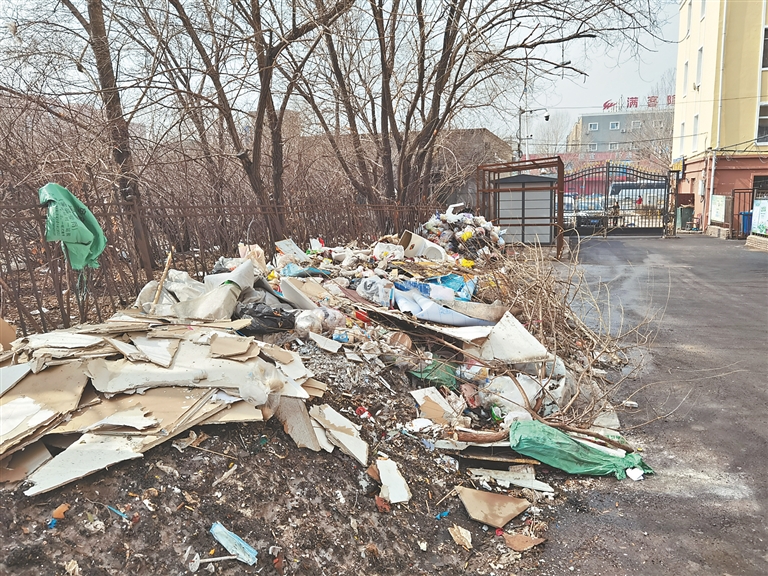 南崗區(qū)學(xué)府路300號(hào)至308號(hào)之間,是一片改造后的老舊小區(qū),一側(cè)大門(mén)還有戴紅袖標(biāo)的人員看守。進(jìn)入后,道路一側(cè)出現(xiàn)了垃圾帶,生活垃圾、裝修垃圾、放棄雜物和殘冰殘雪,堆出了20米的“長(zhǎng)龍”。據(jù)這里的居民介紹,小區(qū)沒(méi)有物業(yè),衛(wèi)生由街道管理?!坝捎陂L(zhǎng)期不外運(yùn),天熱的時(shí)候,這里的垃圾會(huì)很臭。其實(shí)小區(qū)環(huán)境還不錯(cuò),就是缺少管理。”