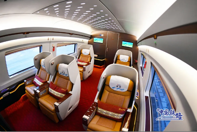 復興號智能動車組車廂內的服務設施進行了智能化升級,進入隧道時,列車可智能控制車內壓力,提前調節(jié)燈光、車窗顏色等。