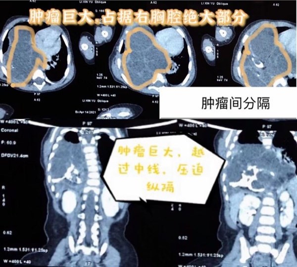 一周前,小彤彤因為氣喘、呼吸困難、惡心在當地醫(yī)院就診,胸片檢查提示隔膨升可能,為了明確診斷來到哈爾濱市兒童醫(yī)院心胸外科就診。戚家峰副主任為孩子進一步進行查體考慮是縱隔腫瘤,通過胸部CT增強造影檢查更加清晰的看到腫瘤的特殊性,該腫瘤幾乎占滿右側胸腔,縱隔被擠壓后導致移位,心臟、食管均有不同程度的受壓影響。而且這個巨大的腫瘤由很多分隔組成,分隔中含有的物質又不同,有囊性組織、實性組織和鈣化組織,考慮畸胎瘤可能。