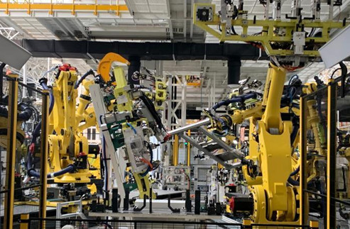 資料圖:江西上饒一家新能源電動汽車公司的智慧工廠內(nèi),機(jī)器人正同時(shí)作業(yè)。 李韻涵 攝