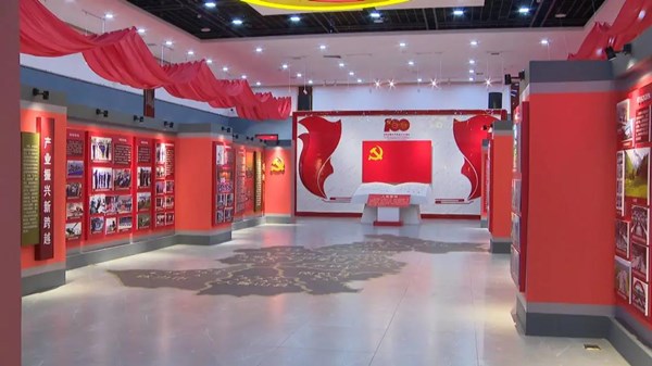 展廳中央懸掛著鮮艷的中國共產(chǎn)黨黨旗。在趙萬山領誓下,大家面對黨旗,舉起右手,重溫入黨誓詞。