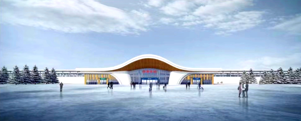 林口南站建筑面積2998.19平方米,可容納800旅客候車。設(shè)2條正線,2條到發(fā)線,站房外觀設(shè)計如同“林中木屋”,融入林口縣特有的“山水神秀”文化底蘊,給人以厚重堅實之感,并將英雄之城的紅色文化融入其中,象征城市精神如山巒屹立。兩側(cè)較小體塊烘托中部門式造型,窗格構(gòu)件相互交織,如森林霧凇,體現(xiàn)寒冷地區(qū)建筑特質(zhì),具有雪原建筑意向。車站穩(wěn)重大氣、簡潔壯麗,通過現(xiàn)代建筑語言詮釋了站房的人文之靈,彰顯現(xiàn)代交通建筑特征。