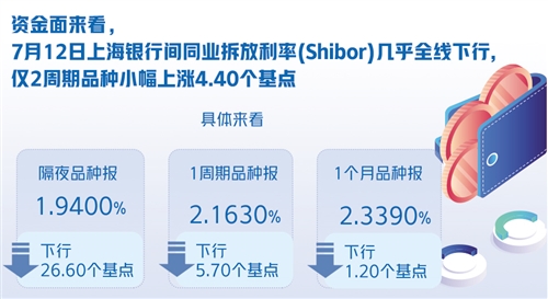 資金面來(lái)看,7月12日上海銀行間同業(yè)拆放利率(Shibor)幾乎全線(xiàn)下行,僅2周期品種小幅上漲4.40個(gè)基點(diǎn)。具體來(lái)看,隔夜品種報(bào)1.9400%,下行26.60個(gè)基點(diǎn);1周期品種報(bào)2.1630%,下行5.70個(gè)基點(diǎn);1個(gè)月品種報(bào)2.3390%,下行1.20個(gè)基點(diǎn)。