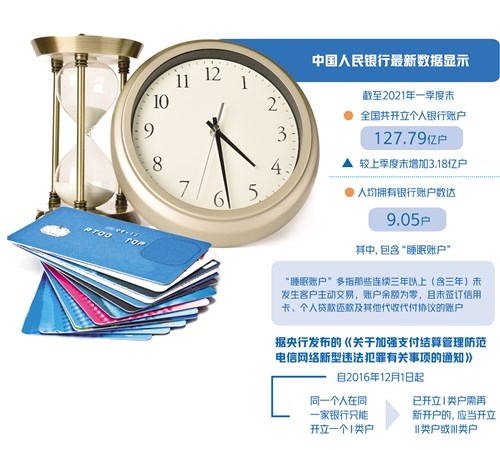 中國人民銀行最新數(shù)據(jù)顯示,截至2021年一季度末,全國共開立個人銀行賬戶127.79億戶,較上季度末增加3.18億戶,人均擁有銀行賬戶數(shù)達9.05戶。