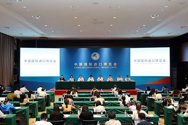 這是第四屆進(jìn)博會(huì)開幕倒計(jì)時(shí)100天新聞通氣會(huì)現(xiàn)場(7月26日攝)。新華社記者 方喆 攝