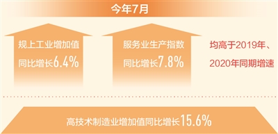 工業(yè)、服務(wù)業(yè)穩(wěn)步增長。7月,全國規(guī)模以上工業(yè)增加值同比增長6.4%,全國服務(wù)業(yè)生產(chǎn)指數(shù)同比增長7.8%,均高于2019年、2020年同期增速;中國制造業(yè)采購經(jīng)理指數(shù)為50.4%,服務(wù)業(yè)商務(wù)活動(dòng)指數(shù)為52.5%,均連續(xù)17個(gè)月高于臨界點(diǎn);服務(wù)業(yè)業(yè)務(wù)活動(dòng)預(yù)期指數(shù)為60.1%,持續(xù)位于較高景氣區(qū)間。