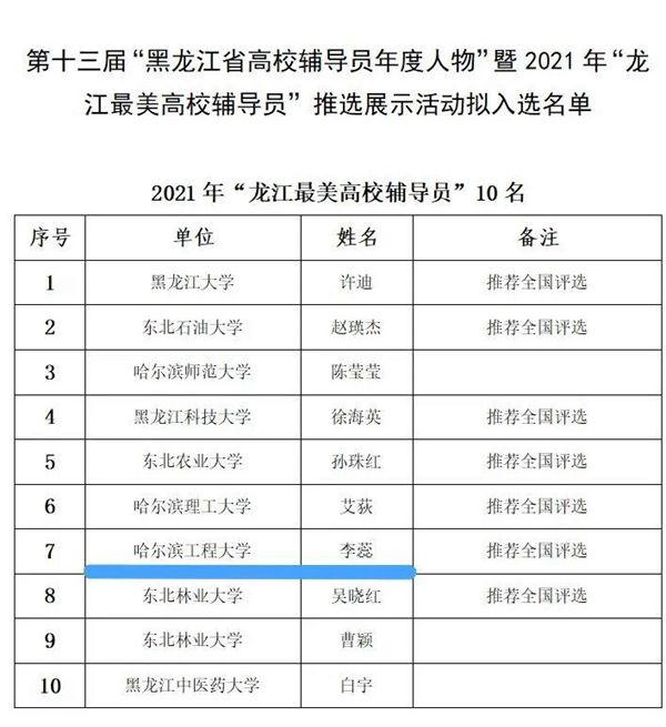 此次活動(dòng)共評選出“第十三屆黑龍江省高校輔導(dǎo)員年度人物”11名,“2021年龍江最美高校輔導(dǎo)員”10名。哈工程輔導(dǎo)員梁艷艷、李蕊憑借高水平的專業(yè)能力、優(yōu)異的工作業(yè)績以及認(rèn)真負(fù)責(zé)的工作精神,在眾多評選者中脫穎而出。