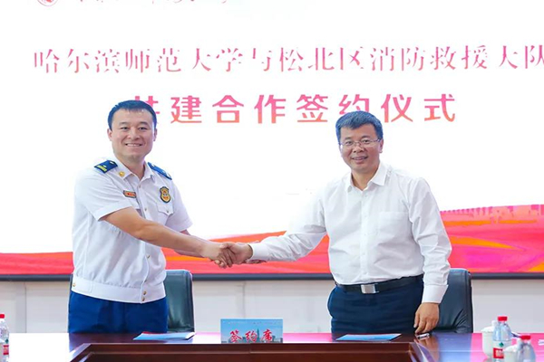 雙方代表簽署《哈爾濱師范大學與松北區(qū)消防救援大隊共建合作框架協(xié)議書》
