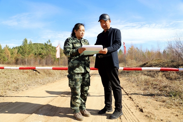 圖為紅旗林場第四管護站管護員孟祥茹(左)認(rèn)真做好入山人員信息登記,實現(xiàn)了人員可追溯、可查詢