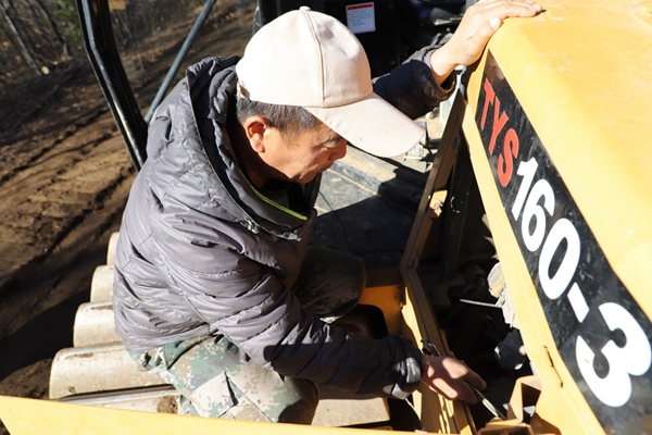 圖為阿木爾林業(yè)局多種經(jīng)營公司大推司機賀傳路保養(yǎng)車輛