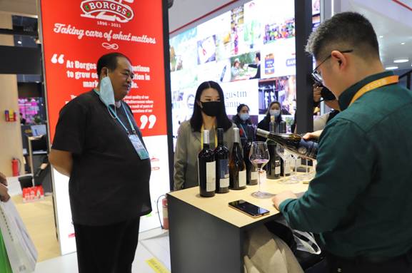 圖為大興安嶺林業(yè)集團(tuán)公司黨委副書記、總經(jīng)理李軍(左二)向法國(guó)參展企業(yè)推介北極冰藍(lán)莓酒莊紅酒系列產(chǎn)品(王力/攝)