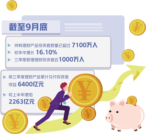 而且,隨著居民財富的不斷積累,投資者的理財意識顯著增強,銀行理財投資者人數(shù)持續(xù)增長,截至9月底,持有理財產(chǎn)品投資者數(shù)量已超過7100萬人,較年中增長16.10%,僅三季度新增理財投資者近1000萬人。在轉(zhuǎn)型過程中,理財產(chǎn)品的投資收益也穩(wěn)中有升,前三季度理財產(chǎn)品累計兌付投資者收益6400億元,較上半年增加2263億元。