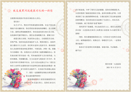 據(jù)介紹,省醫(yī)院支援黑河應(yīng)急醫(yī)療隊共收治新冠肺炎患者69人,其中重癥1例,最小的患者2歲,最大的患者90歲,在兄弟單位接手前,共治愈出院35人。治療期間,醫(yī)療隊收到了多封患者表揚(yáng)信,小患者們則用畫筆表達(dá)了對天使們的感謝與敬仰,有的未出院患者聽說省醫(yī)院醫(yī)療隊要離開了,都依依不舍,紛紛表達(dá)對醫(yī)療隊精湛的醫(yī)技和暖心醫(yī)療的感謝。