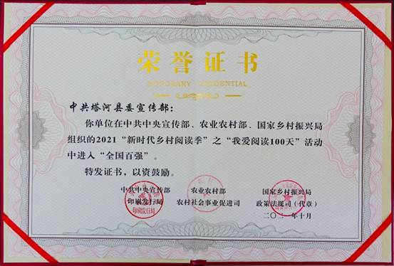 塔河縣委宣傳部在2020、2021連續(xù)兩年榮獲“新時(shí)代鄉(xiāng)村閱讀季”全國(guó)百?gòu)?qiáng)榮譽(yù)稱號(hào),