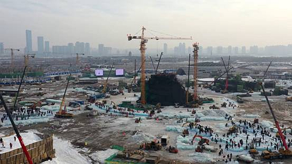 記者在哈爾濱冰雪大世界園區(qū)建設(shè)現(xiàn)場(chǎng)看到,工人們有序地忙碌著,塔吊、叉車、鏟車等各種機(jī)械設(shè)備在緊張作業(yè),工人切冰、鏟冰的聲音與作業(yè)機(jī)械的轟鳴聲,在園區(qū)內(nèi)交織成一首“建設(shè)交響樂(lè)”。