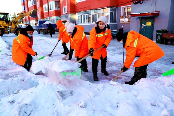 在清掃過(guò)程中,環(huán)衛(wèi)職工冒著零下30多度的嚴(yán)寒,移動(dòng)車輛、鏟除積雪、揮舞工具,僅用40多分鐘完成了一棟樓前硬化地面的清理任務(wù)。