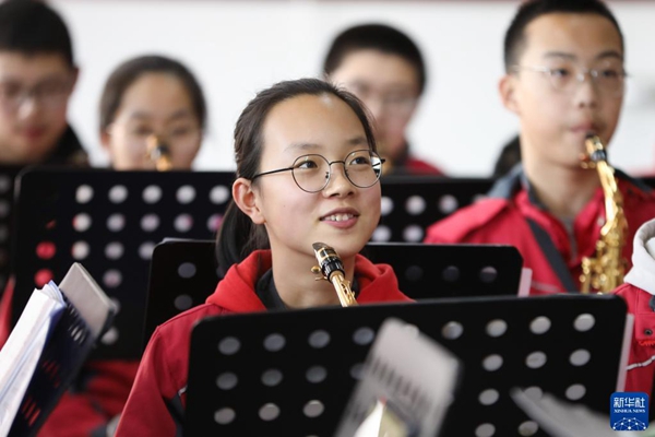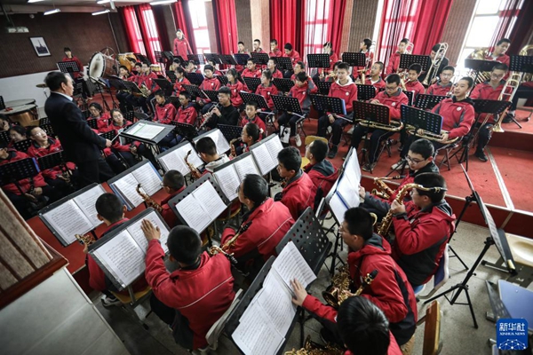2022年寒假,在甘肅省白銀市會(huì)寧縣,會(huì)師中學(xué)交響管樂(lè)團(tuán)的孩子們?cè)谕瓿珊僮鳂I(yè)之余排練《紅旗頌》。早在2011年,會(huì)寧縣會(huì)師中學(xué)就東挪西借組建了第一個(gè)交響樂(lè)樂(lè)團(tuán)。平時(shí),學(xué)校為樂(lè)團(tuán)的學(xué)生免費(fèi)上樂(lè)器課,學(xué)生自愿報(bào)名參加、自愿購(gòu)買(mǎi)小型樂(lè)器。如今,《紅旗頌》《長(zhǎng)征組歌》等已成為樂(lè)團(tuán)的保留曲目。