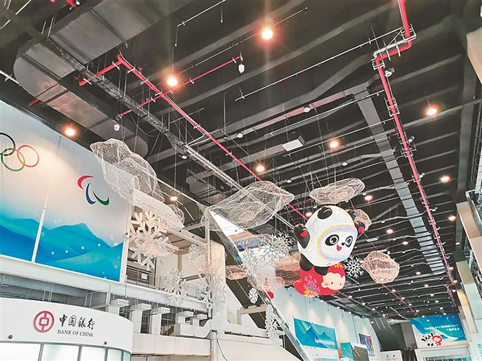 進(jìn)入主媒體中心一層,懸在半空中碩大的冰墩墩和雪容融頗為吸睛,很多媒體記者爭(zhēng)相與其合影。不遠(yuǎn)處,一塊巨大電子高清屏幕,正播放著短道速滑世界杯的比賽視頻,畫(huà)面清晰得如同親臨賽場(chǎng)。