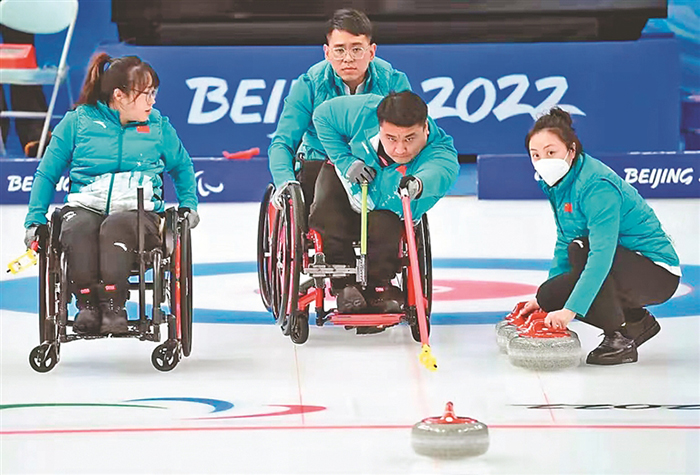 北京冬殘奧會的第一天,中國輪椅冰壺隊開局不利,先后不敵加拿大隊和瑞典隊,壓力可想而知。之后中國隊迅速調(diào)整狀態(tài)。6日,9:3戰(zhàn)勝愛沙尼亞隊,贏得循環(huán)賽首勝。7日,接連戰(zhàn)勝韓國隊和瑞士隊,以三勝兩負(fù)的戰(zhàn)績與拉脫維亞隊并列第三名。11日,中國隊對陣加拿大隊爭奪決賽名額。12日,輪椅冰壺決賽中,中國隊在前四局1:2落后瑞典隊的情況下改變戰(zhàn)術(shù),利用對手失誤成功拿到4分。最終,中國輪椅冰壺隊8:3戰(zhàn)勝瑞典奪得冠軍。