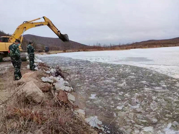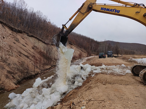 加格達(dá)奇林業(yè)局利用挖掘機(jī)開(kāi)展破冰作業(yè)(趙子敬 攝)