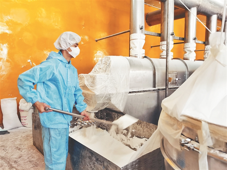 4月18日,新生村溫室大棚內(nèi),女村民們忙著往糖渣靈芝菌包里接靈芝菌。靈芝項目負責(zé)人肖劍說,木糖渣制備靈芝菌包,先配比混合均勻裝袋,菌包高溫滅菌后接菌、養(yǎng)菌。菌包移棚種植,靈芝出芽后進行芝芽修剪,抽取靈芝噴粉,待一個靈芝種植周期過后,廢棄糖渣菌袋將被回收,粉碎做有機肥入田。