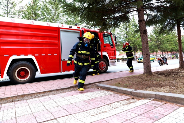 阿木爾林業(yè)局城鎮(zhèn)消防大隊(duì)?wèi)?zhàn)斗員迅速到達(dá)模擬火警點(diǎn),開展救助行動(dòng)(王力 攝)