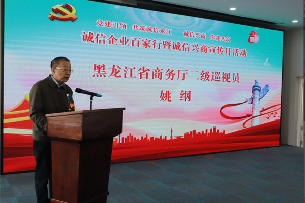 省商務廳二級巡視員姚綱在致辭中指出,此次黑龍江省“誠信企業(yè)百家行”暨“誠信興商宣傳月”活動,是加強誠信宣傳,提升全社會誠實守信意識,優(yōu)化消費和營商環(huán)境的一次重要舉措。省商務廳將會同相關單位統(tǒng)籌協調、密切配合,做到政府帶頭講誠信,商貿流通企業(yè)為“誠信興商”活動主體,通過宣傳商務誠信文化和信用管理知識,引導市場主體樹立誠信興商經營理念,提高信用管理能力,營造崇信守法的營商環(huán)境。培育消費者信用消費習慣,提升風險防范意識,依法維護自身合法權益,引導和帶動整個商貿行業(yè)的誠信建設。