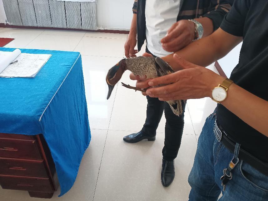 工作人員正在對(duì)綠翅鴨進(jìn)行檢查救助