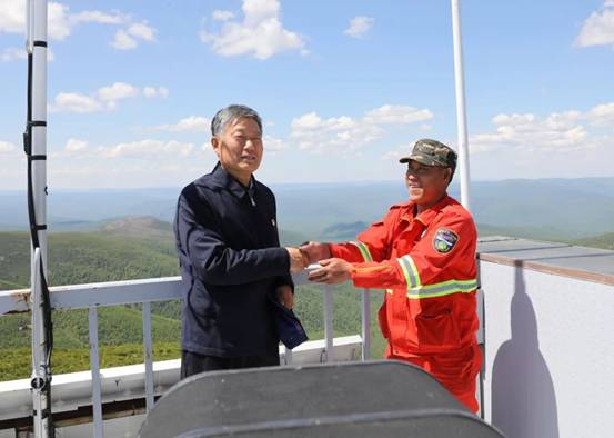 國家林草局防火督查專員王海忠與瞭望員親切交談,了解他們的工作細節(jié),叮囑他們堅守崗位,鉆研業(yè)務,不斷提高瞭望能力,有火快報,有火報準,為快速撲滅爭取寶貴時間。