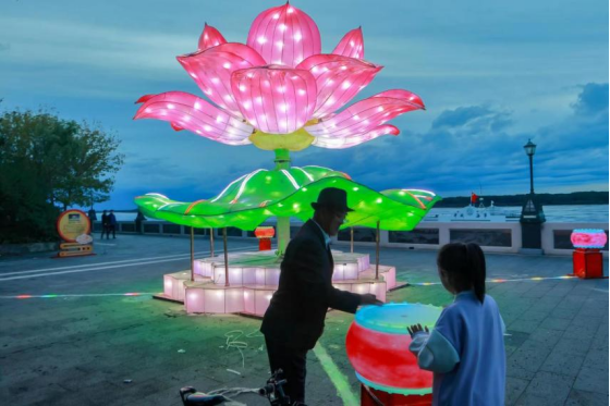 華燈初上,市民和游客紛紛“逐”光而來(lái),圍繞在燈組旁嬉戲玩耍,拍照留念,歡聲笑語(yǔ)在龍鄉(xiāng)秋夜里久久回蕩。景觀燈光秀中最有設(shè)計(jì)感的應(yīng)數(shù)“盛世第一蓮”燈組了,它以嘉蔭蓮化石——中國(guó)“第一蓮”為設(shè)計(jì)靈感,以蓮喻廉,借此弘揚(yáng)廉潔文化。