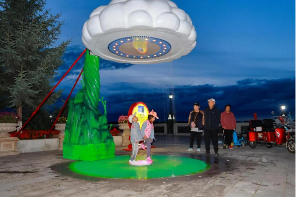 人氣最高的應(yīng)數(shù)“千年云雨”燈組,運(yùn)用了水流循環(huán)系統(tǒng)與燈光相結(jié)合,形成了可互動(dòng)、可參與、可觀賞的趣味云雨再現(xiàn),引發(fā)人們對(duì)千年前恐龍時(shí)代自然天象的無(wú)限聯(lián)想,體現(xiàn)了古與今一脈相承、生靈與自然和諧共處。