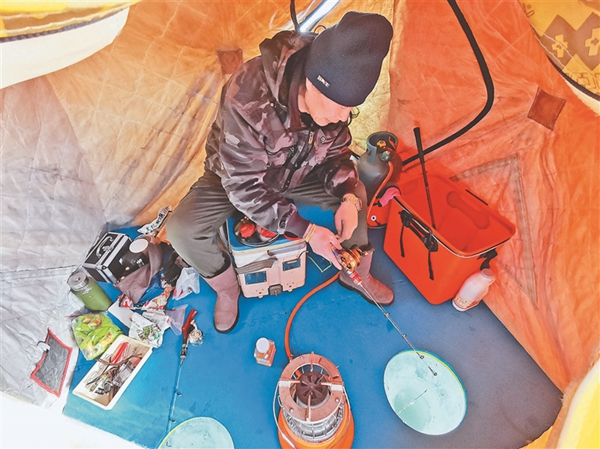 比賽現(xiàn)場(chǎng),冰面上色彩各異的帳篷錯(cuò)落排開(kāi),來(lái)自我省東部地區(qū)多個(gè)地市的70名釣魚(yú)愛(ài)好者聚集在此,感受垂釣魅力。當(dāng)日室外最低溫度零下20℃,而冰釣帳篷內(nèi)卻是熱氣騰騰。選手們用小火爐取暖,調(diào)料、打窩,各展技藝,不一會(huì)兒都收獲頗豐。