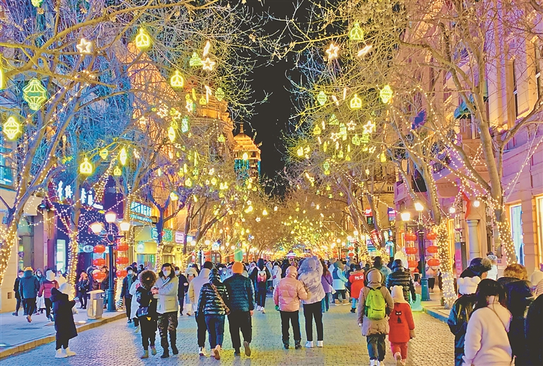 穿過(guò)歐式建筑,滿滿冰城風(fēng)情的彩燈以及年味十足的大紅燈籠將哈爾濱中央大街點(diǎn)亮。2023年新年伊始,百年老街呈現(xiàn)出游人如織的火熱場(chǎng)面,熟悉又熱鬧的氣氛彌漫在老街的各個(gè)角落,煙火氣持續(xù)升騰。欣賞唯美的陽(yáng)臺(tái)音樂(lè)秀,品嘗鍋包肉、馬迭爾冰棍等特色美食,打卡“星空燈”、“雪妮妮網(wǎng)紅兔子”雪雕……游客和市民沉浸在一個(gè)個(gè)融合創(chuàng)意與冰城特色的冰雪玩法和體驗(yàn)之中,盡情享受冰雪帶來(lái)的歡樂(lè)。數(shù)據(jù)顯示,僅春節(jié)期間,中央大街日均客流量維持在40萬(wàn)人次,高峰時(shí)期達(dá)到70余萬(wàn)人次。
