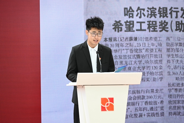 來自哈爾濱理工大學(xué)的獲獎學(xué)生程同學(xué)代表全體獲獎學(xué)生向共青團(tuán)、希望工程、哈爾濱銀行表示感謝,并表達(dá)了自己在課業(yè)之余會積極參加“丁香綻放·童心港灣”等志愿服務(wù)項(xiàng)目,把公益火種延續(xù)下去。