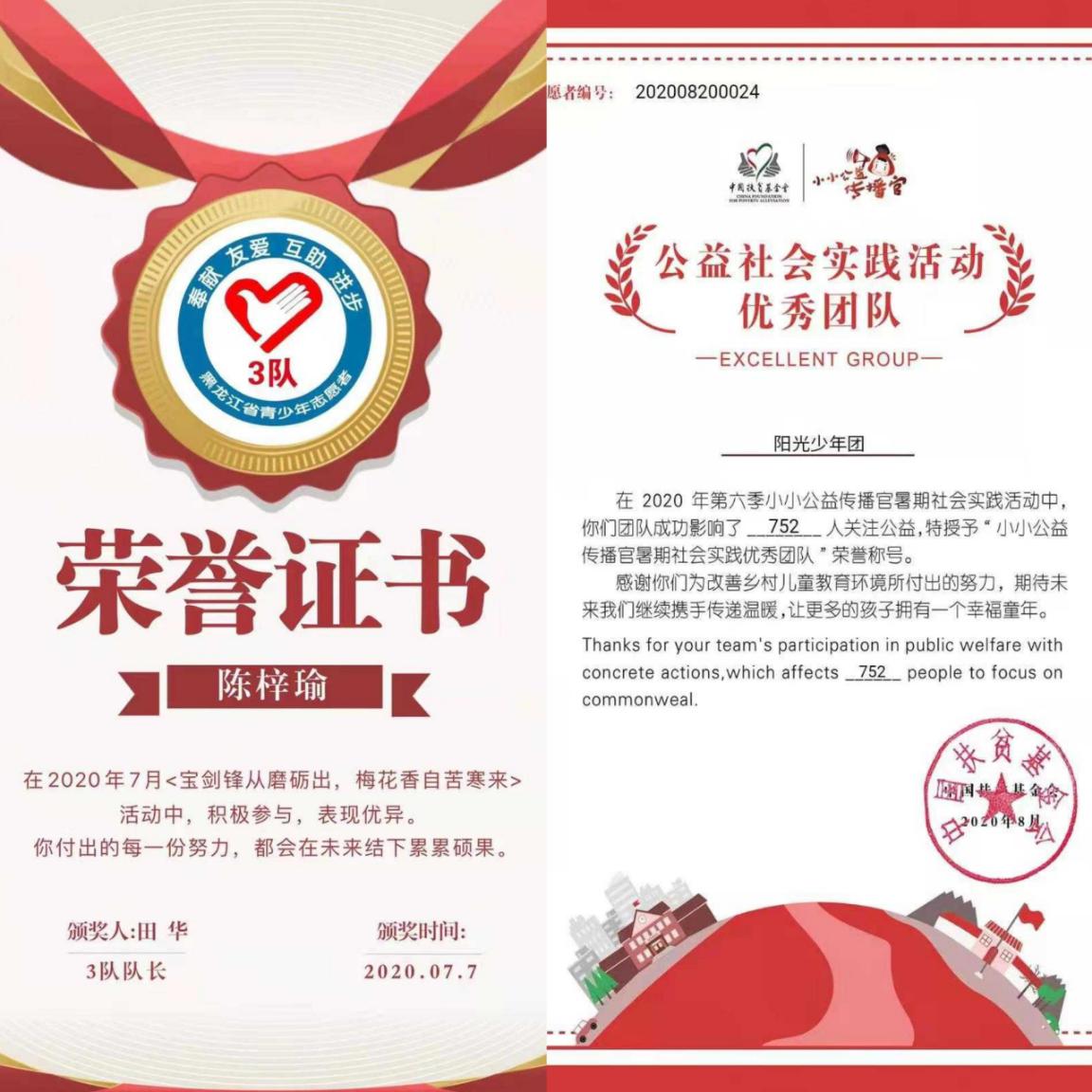 她在志愿服務中不怕苦不怕累,圓滿完成各項任務,獲得各界一致好評,先后獲得省市(區(qū))的相關(guān)表彰,并被省幫扶中心授予“愛心少年”榮譽稱號。