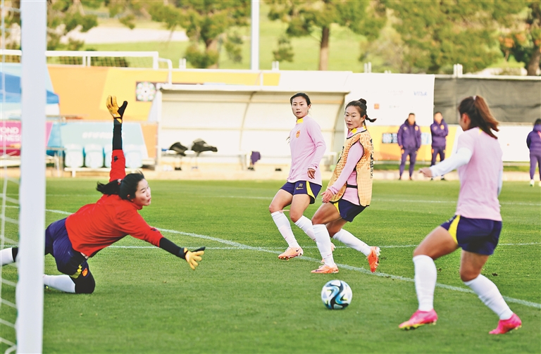 7月10日歸隊的王霜已完全融入,過障加速、接球射門,王霜彈無虛發(fā)。在6對6半場演練中,助理教練馬曉旭加入到王霜率領的黃隊,與唐佳麗、張馨所在的紅隊展開對攻大戰(zhàn)。快速的攻防轉換、漂亮的進球讓看臺上的球迷興奮不已,有球迷甚至打開了手機直播。