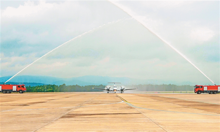 伴隨著飛機(jī)的轟鳴聲,命名為“林都號(hào)”的國(guó)王350飛機(jī)平穩(wěn)降落林都伊春,緩緩駛向林都機(jī)場(chǎng)5號(hào)停機(jī)坪。當(dāng)飛機(jī)落地脫離跑道后,左右兩側(cè)的消防車(chē)開(kāi)始噴射水霧,兩束水霧相互交錯(cuò),以“水門(mén)禮”熱烈歡迎乘坐“林都號(hào)”來(lái)伊春的游客。