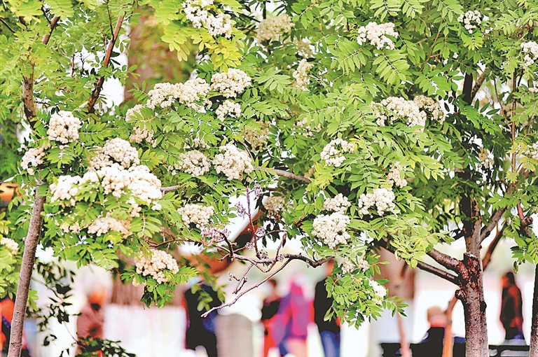 日前,哈爾濱市道里區(qū)松花江畔,四五棵花楸樹(shù)上,白色的花朵迎風(fēng)綻放,非常美麗,吸引許多游人觀看、拍照。