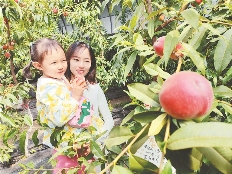 “我認養(yǎng)了一棵桃樹,今天和妻子共同看看桃子的長勢,過些天就可以親自采摘了?!标P勇和妻子正在查看認養(yǎng)的桃樹。