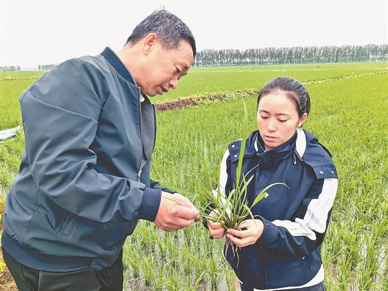 農(nóng)技專(zhuān)家在查看水稻秧苗。孫永凡攝
