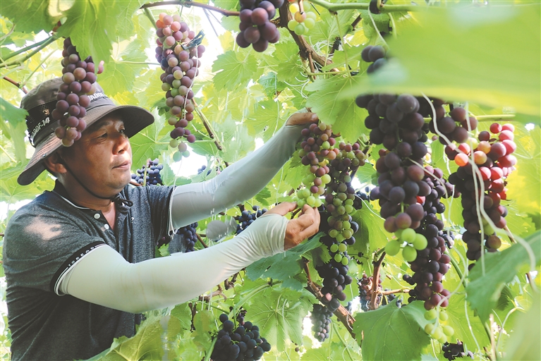 “春棚栽培的葡萄在8月中旬成熟,而在暖棚里,由于溫度、濕度得到科學(xué)精準(zhǔn)控制,葡萄成熟得更早,產(chǎn)量更高。7月10日左右即可上市,搶占市場(chǎng)空缺。”蔬菜公司負(fù)責(zé)人王軍強(qiáng)邊說一邊拿起手機(jī)拍攝,為一周后葡萄上市進(jìn)行宣傳。