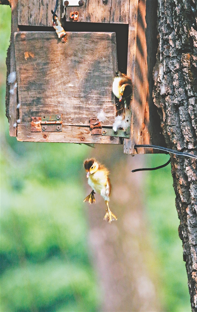 當(dāng)13只小鴛鴦跳完,最后一只卡在木頭縫隙中遲遲下不來,鳥媽媽帶著其他孩子在鴛鴦池塘上焦急地向巢上眺望,不時(shí)發(fā)出“咳、咳”的叫聲,召喚它快些跳下來。在一番“手蹬腳刨”后,這只身體有些單薄的小家伙終于掙脫而出,飛身躍到池塘邊的臺階上,然后再躍身跳到池塘里游到媽媽身邊。