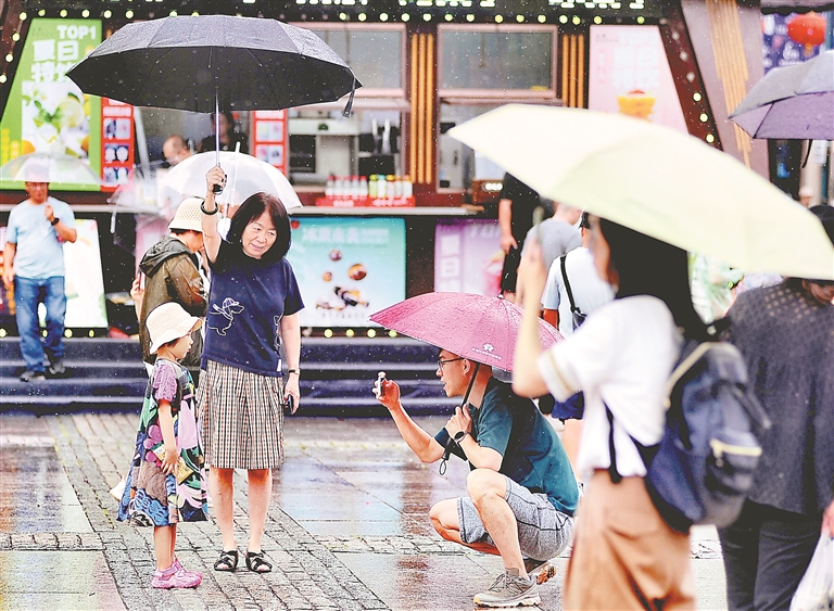 23日,哈爾濱市出現(xiàn)陣雨天氣。在索菲亞教堂、中央大街、江畔等地,游客們一邊觀賞美麗風景,一邊享受夏日清涼。