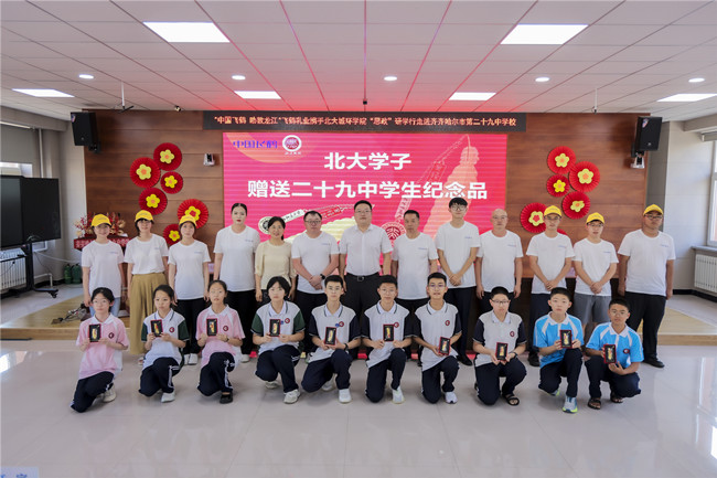 北大學(xué)子向齊市二十九中學(xué)生贈送紀(jì)念品并合影