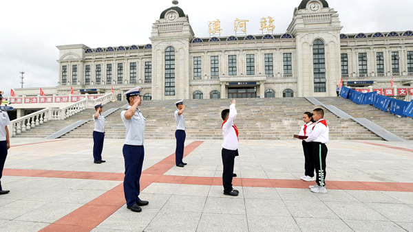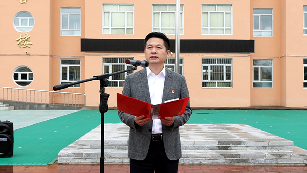 在國旗下,漠河市邊境檢查站代表陳澤和“全區(qū)十佳駐村干部”王成龍用自己生動(dòng)的故事為在場的每位少先隊(duì)員們上了一堂生動(dòng)的國防教育課,漠河市的少先隊(duì)員代表王涵在國旗下表達(dá)了對(duì)祖國的熱愛和對(duì)戍邊工作者們的敬佩。團(tuán)省委副書記陳海萍在講話中鼓勵(lì)少先隊(duì)員要學(xué)習(xí)漠河戍邊工作者們的堅(jiān)韌不拔和無私奉獻(xiàn),要立足祖國最北方志存高遠(yuǎn)、勤奮學(xué)習(xí)、錘煉品德、強(qiáng)健體魄,敢于創(chuàng)新、富于創(chuàng)意、樂于創(chuàng)造,要沿著“入隊(duì)、入團(tuán)、入黨”的“人生三部曲”奮力前進(jìn),為推進(jìn)中國式現(xiàn)代化、實(shí)現(xiàn)強(qiáng)國復(fù)興偉業(yè)貢獻(xiàn)青春力量。