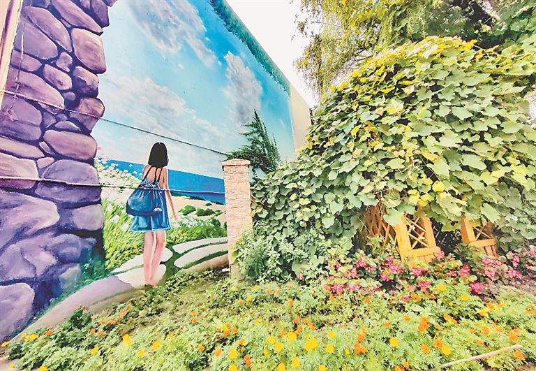 哈爾濱市道外區(qū)東直路上,路邊的花卉景觀與墻體彩繪互相映襯,成為街頭一道美麗風(fēng)景,引得人們紛紛駐足觀看。畫里的溪流、小徑、樹木、花草、動(dòng)物與畫外的綠地巧妙結(jié)合起來,融為一個(gè)整體,創(chuàng)意新穎,視覺效果良好,讓人眼前一亮。