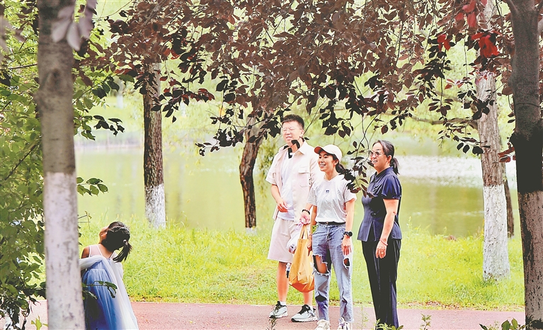 周末,雙鴨山市市政廣場附近的安邦河畔,花草樹木郁郁蔥蔥,風(fēng)景如畫。