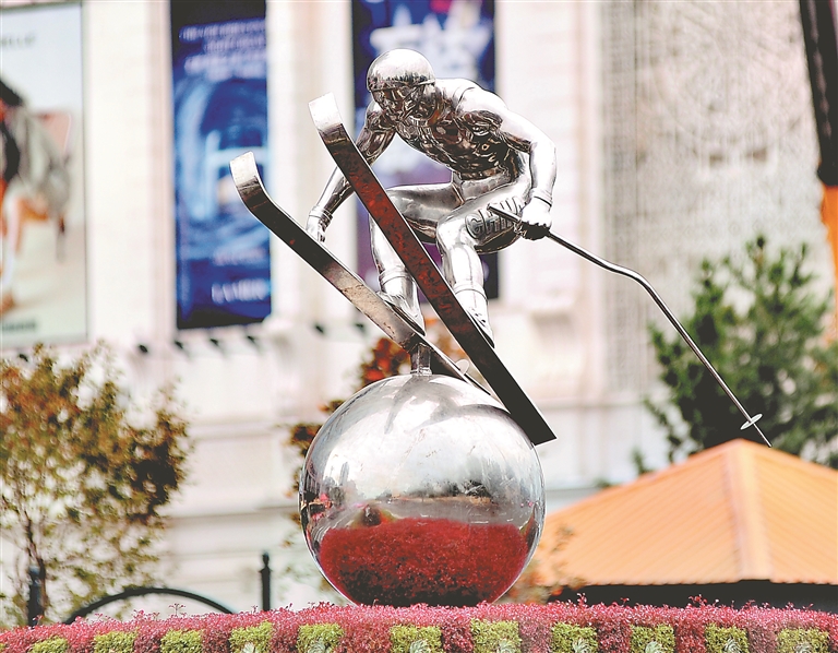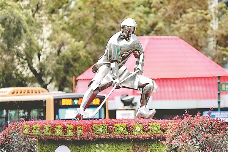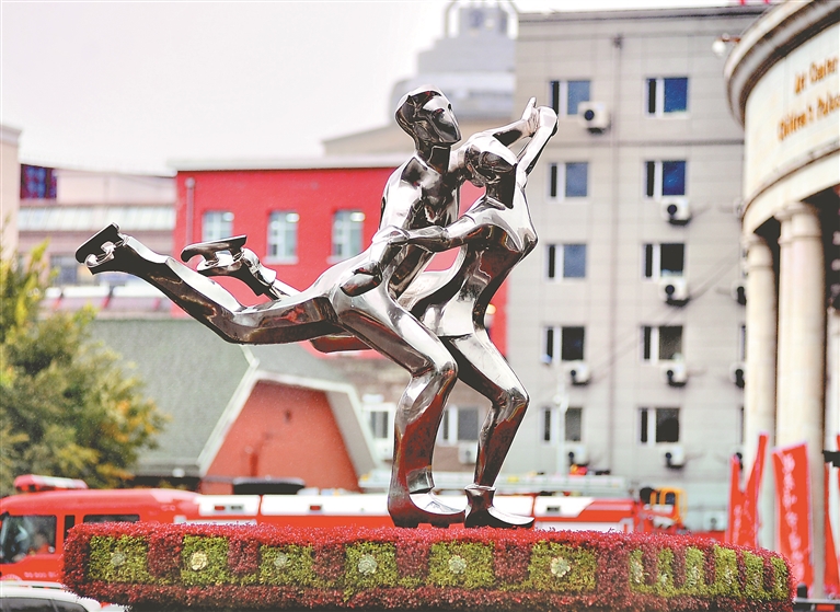 9日,在哈爾濱市南崗區(qū)紅軍街上,一處綠地里以亞冬會冰雪比賽項(xiàng)目為主題的雕塑群吸引了行人的目光。這些雕塑外觀銀色、制作精美、栩栩如生,展現(xiàn)了運(yùn)動員奮力拼搏、勇往直前的精神風(fēng)貌。