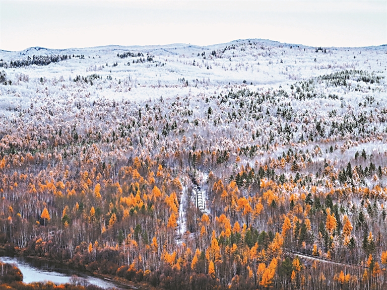 從空中俯瞰最北邊城儼然已經(jīng)進(jìn)入冬季。眼下正值漠河的金秋時(shí)節(jié),突如其來(lái)的降雪為北國(guó)秋色增添了別樣美景。松枝上布滿了厚厚的雪球,山林之間的秋色景觀與皚皚白雪同框,火車在白雪森林間穿行而過(guò),令南方游客驚嘆不已。本報(bào)記者 張磊攝